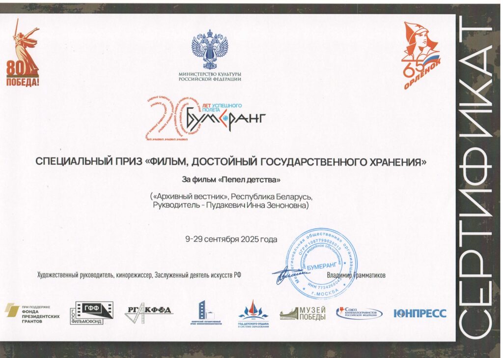 Сентябрь 2025 года стал знаковым для Всероссийского открытого фестиваля-форума детского и юношеского экранного творчества «Бумеранг», который отметил своё 20-летие на площадке Всероссийского детского центра «Орлёнок». В юбилейной медиасмене приняли участие 200 юных журналистов и кинематографистов из 98 медиастудий России и Беларуси. Среди них — команда школы юного архивиста «Архивный вестник» при ЗГА в г. Молодечно, которая привезла домой Гран-при за лучший бэкстейдж.