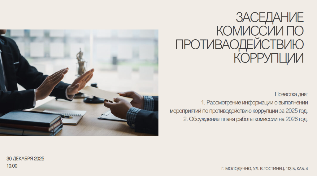 Сообщаем, что заседание комиссии по противодействию коррупции архива состоится 30 декабря 2025 года в 10:00 в каб. №4 архива.