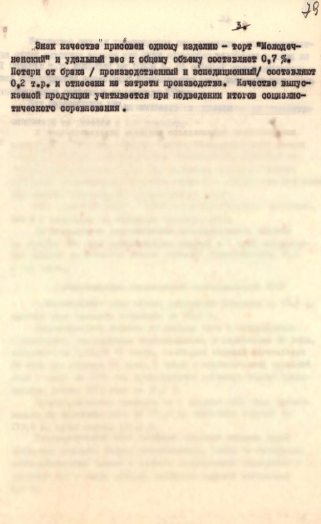 Первый материал челленджа посвящён «Молодечненскому торту». Из архивных документов мы узнаём, что кондитерское изделие, выпускавшееся на местном хлебозаводе, в 1976 году было удостоено знака качества. Это свидетельствует о высокой культуре производства и стабильности рецептуры, а также о том, что любимое праздничное угощение молодечненцев получило официальное признание на государственном уровне.