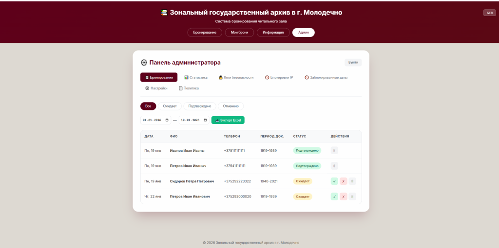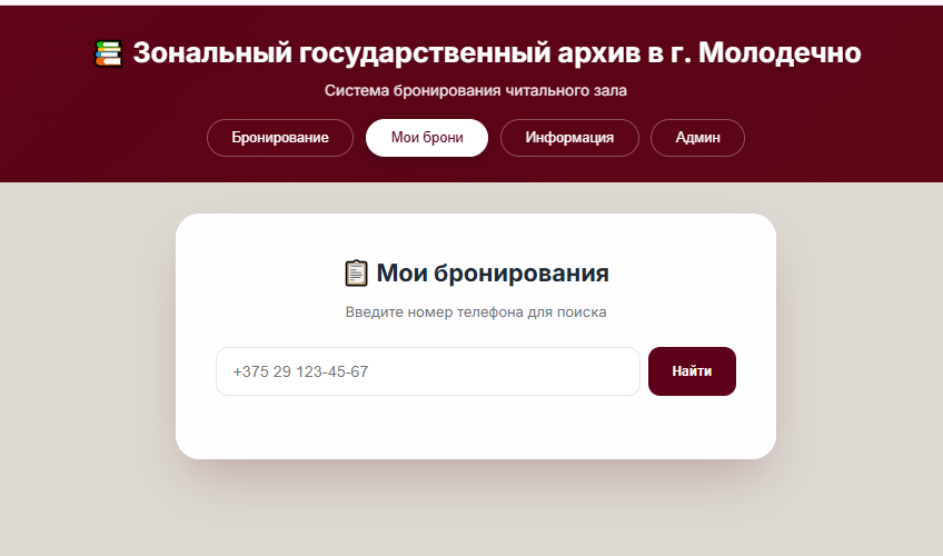 Для сотрудников архива система также приносит значительные преимущества. Архивисты-администраторы после авторизации могут отслеживать записи пользователей в реальном времени, видеть календарь бронирования и управлять потоками посетителей. Это оптимизирует работу читального зала и предотвращает переполненность. Автоматизация процессов дает возможность исключить необходимость ведения бумажных журналов, упрощает работу архивистов и позволяет сосредоточиться на более важных задачах.