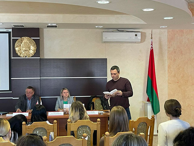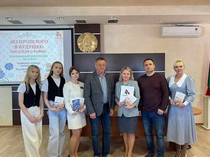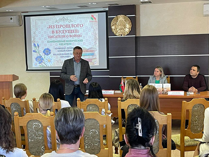 В рамках мероприятия «Из прошлого в будущее: писатели о войне», подготовленном Молодечненской районной организацией РОО «Белая Русь», в Ледовом дворце г.Молодечно состоялась встреча с председателем Минского областного отделения Союза писателей Беларуси Леонидом Михайловичем Кривоносом и его заместителем Рагнедом Юрьевичем Малаховским. Писатели поделились своим творчеством, историями создания произведений и рассказывали о том, что их вдохновляет. Встреча представляла собой открытый диалог между поэтами и зрителями, в котором участники смогли задать гостям интересующие их вопросы. Особое внимание было уделено актуальным темам сохранения исторической памяти о Великой Отечественной войне, народному единству, а также роли поэзии в современном мире.